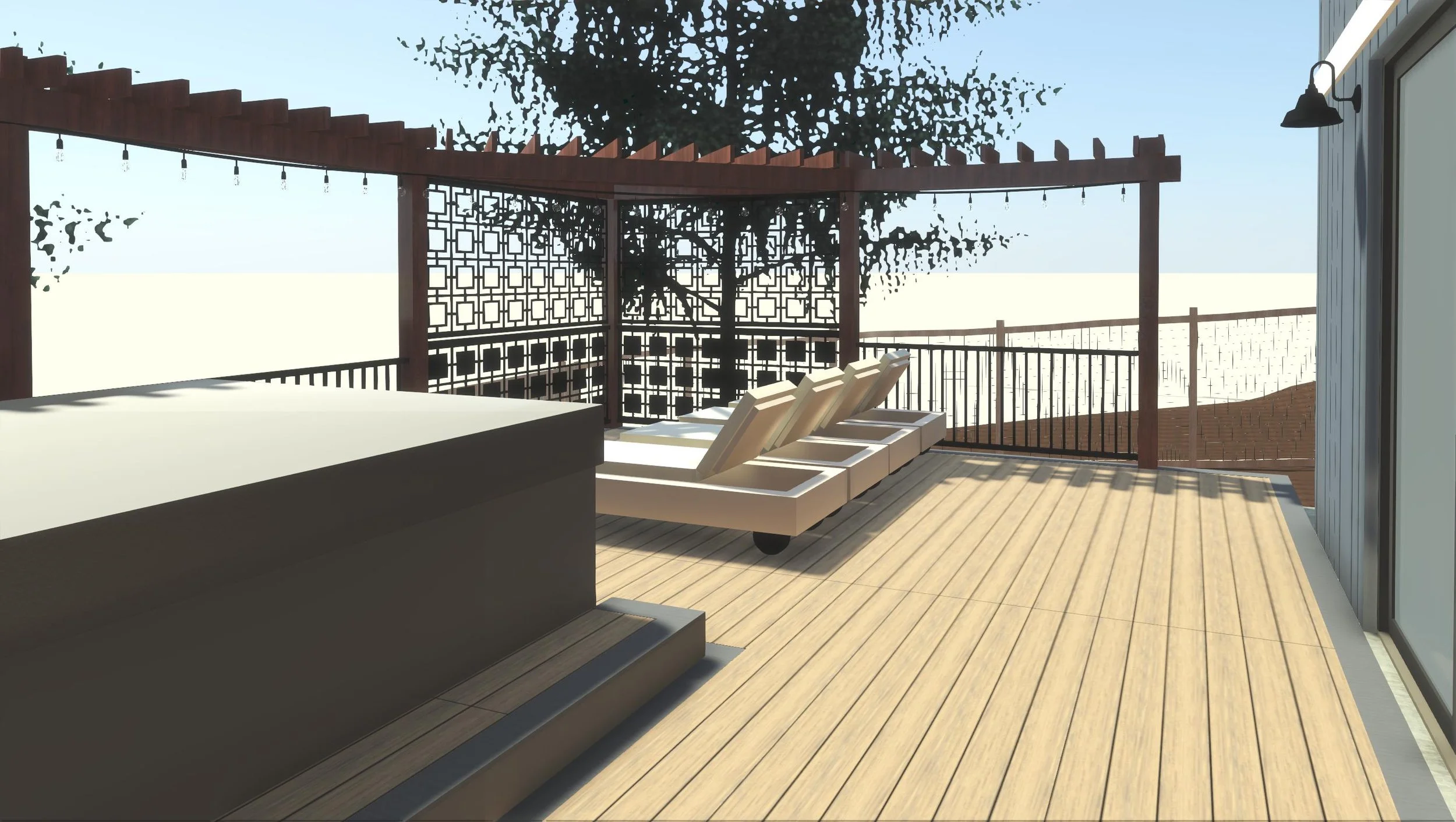 The expansive layout includes dedicated zones for an outdoor kitchen and dining area, a poolside lounge, and a cozy fire pit lounge—making it a true hub for entertaining. Pergolas provide shade, structure, and ambiance, with opportunities for string lights and shade sails to enhance comfort and atmosphere. This modernized deck not only amplifies the home's livability but also creates a strong visual and functional link to the newly landscaped yard below.